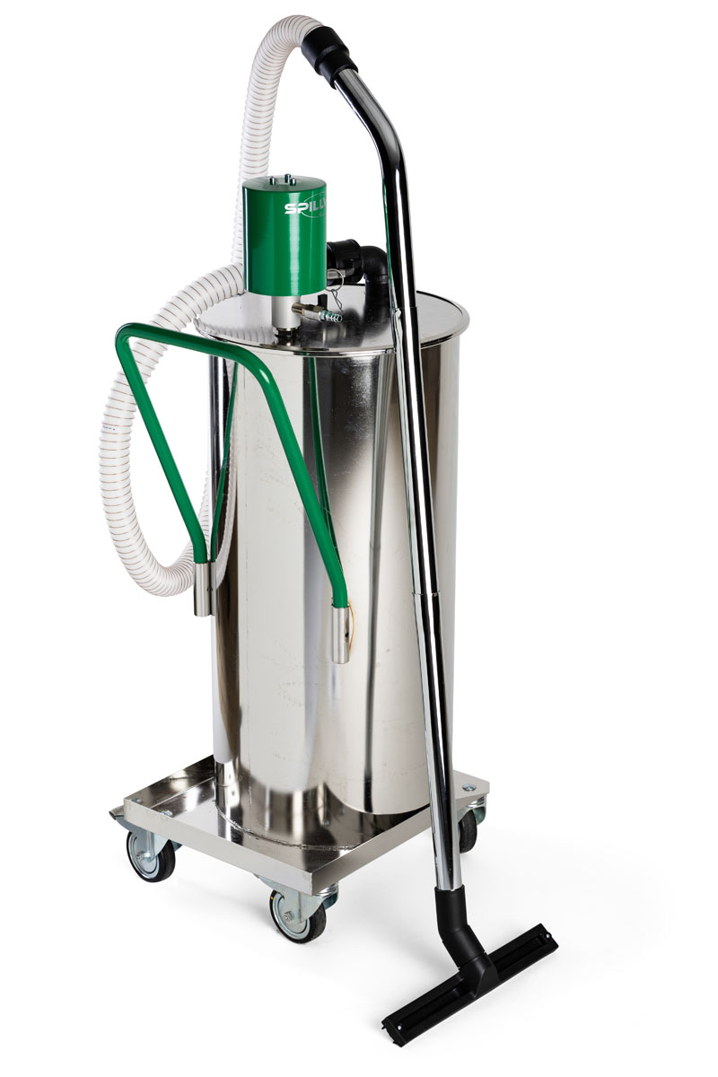 Maintenance-free wet vacuum with bottom 1” drain with valve, specially designed for tight spaces such as workshops, oil platforms, ships, etc. Supplied complete with a 80-liter container.